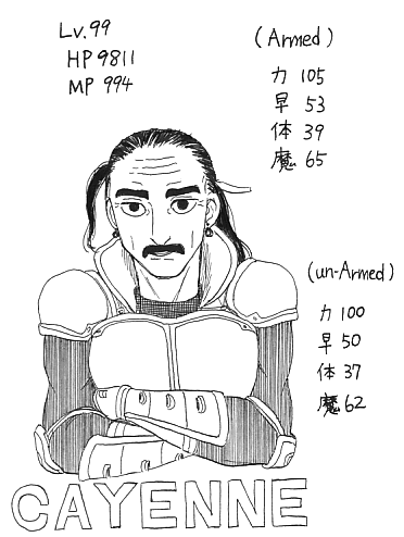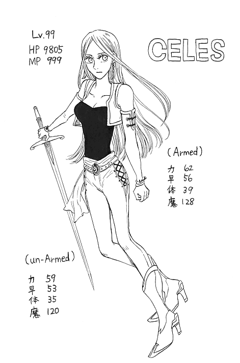 セリス:黄色 ! 髪の色ですね・・・。(2回目) あと服の色(天野さんデザの方)。私は基本天野さんデザのパンツスタイルセリスをかいてるので、それもあってセリスは黄色一択に。セリスの、ぱっと鮮やかな金の髪が好きです!(突然の告白)