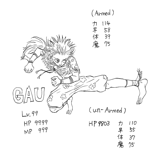 ガウ:黄緑 ! 髪の色ですね・・・。 意外と他に緑系のイメージのキャラがいないので、個性を感じられてなんかいいな・・・。ガウは服の色も黄色、オレンジ、緑と自然界っぽいカラーですごく合ってるよな~^^と思ったり。