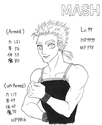 マッシュ:さらに明るいブルー というか水色なのか?(ペンの名前は「ライトブルー」でした)エドガーと同色にしてもいいかと思ったけど一応変えました。フィガロ兄弟は青色似合うイメージ・・・ だけどマッシュは熱血キャラなので赤系でも合うのかも?レッドジャケットとかレッドキャップとか装備するし(←?)