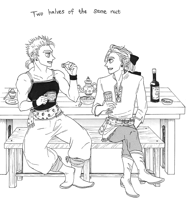 ゴゴ:ゴゴを一色で表すの無理やろ・・・ とこの絵をかきはじめた最初からこの問題にはブチ当たっていたのですが、あ、もうゴゴだけは多色でいいか・・・と途中から開き直り・・・ あれですよ、ものまね師だから自分の色は持たないんですよきっと・・・かきながらゴゴの服って、他のメンバーの衣装から少しずつ布をもらってきたような感じだな~と改めて思った。ゴゴというキャラクターらしさがありますね^^