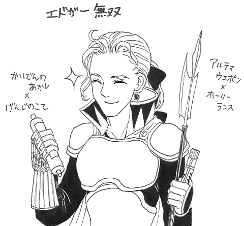 狂信者の塔を途中まで登ってホーリーランスをゲット済だったのと、現在(僅差ですが)HPが一番高いフィガロ王にアルテマウェポンを二刀流させて、ただいまエドガー無双状態に。