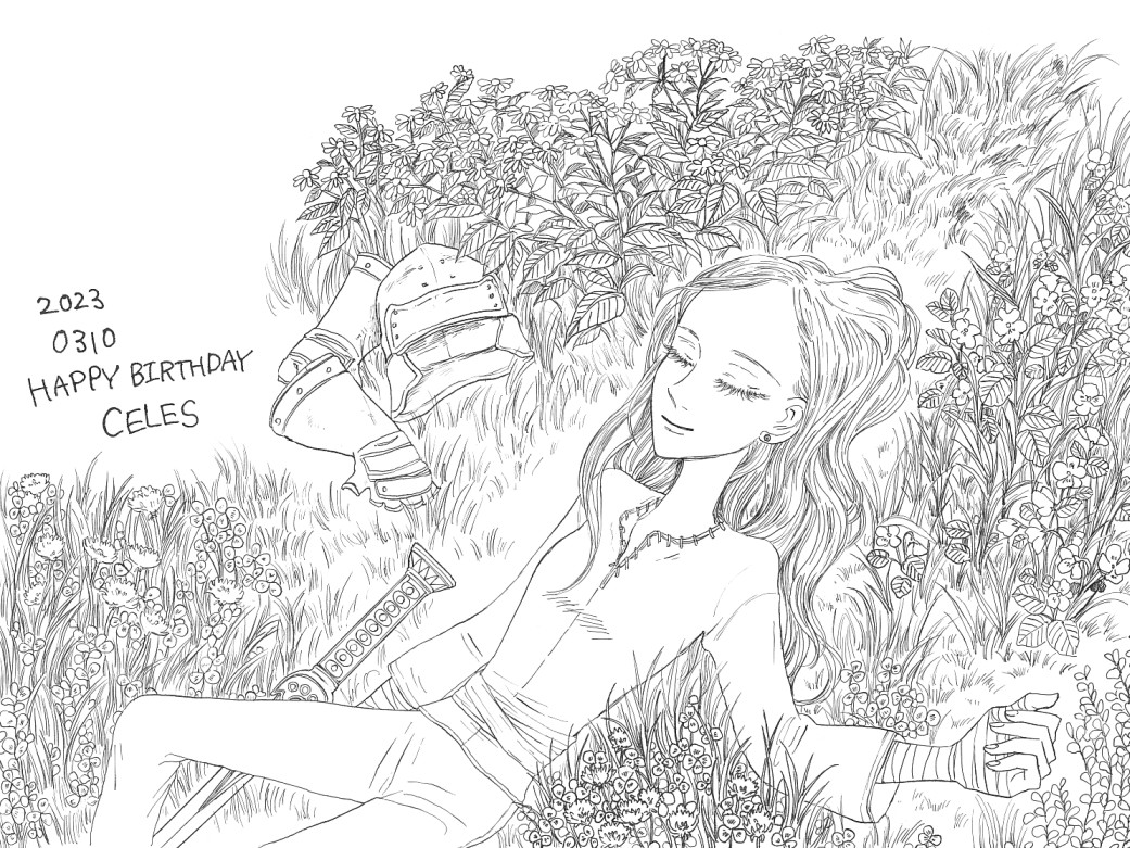 セリスでほぼ力尽きて草っぱらの線が太くなってしまった。背景ももっと時間かけて丁寧にかきたたいとは思ってるんだけど・・・