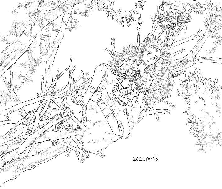 ガウの野生児感について勝手なイメージを膨らませる中で、(夜とか適当な木の上で寝たりしそう)って妄想したりしていたけど、(徐々に仲間がねぐらにしてるテントの中にも入ってくるようになるとかいいかも・・・)って段階を踏んだ妄想をマンガにしました。