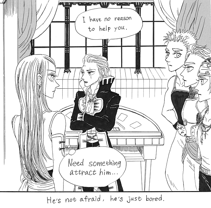 反帝国のためにと協力を求めてもいまいちな反応のセッツァー、善悪に興味がないから、帝国の行いの是非を言葉で説得してもあまり響いてない感じで。
